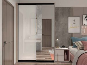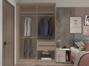 The sliding door feature of this wardrobe saves valuable floor space, making it suitable for both large and small rooms. Internally, the wardrobe is equipped with customizable storage options like hanging rods, shelves, and drawers, all designed to keep your belongings organized and easily accessible.