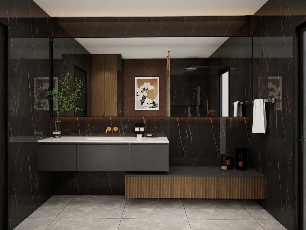 The cabinets feature a deep black melamine finish that not only enhances the visual appeal but also offers resistance to moisture and wear, making it ideal for bathroom use. This finish complements the natural marble backdrop, which adds a touch of luxury and sophistication to the space.